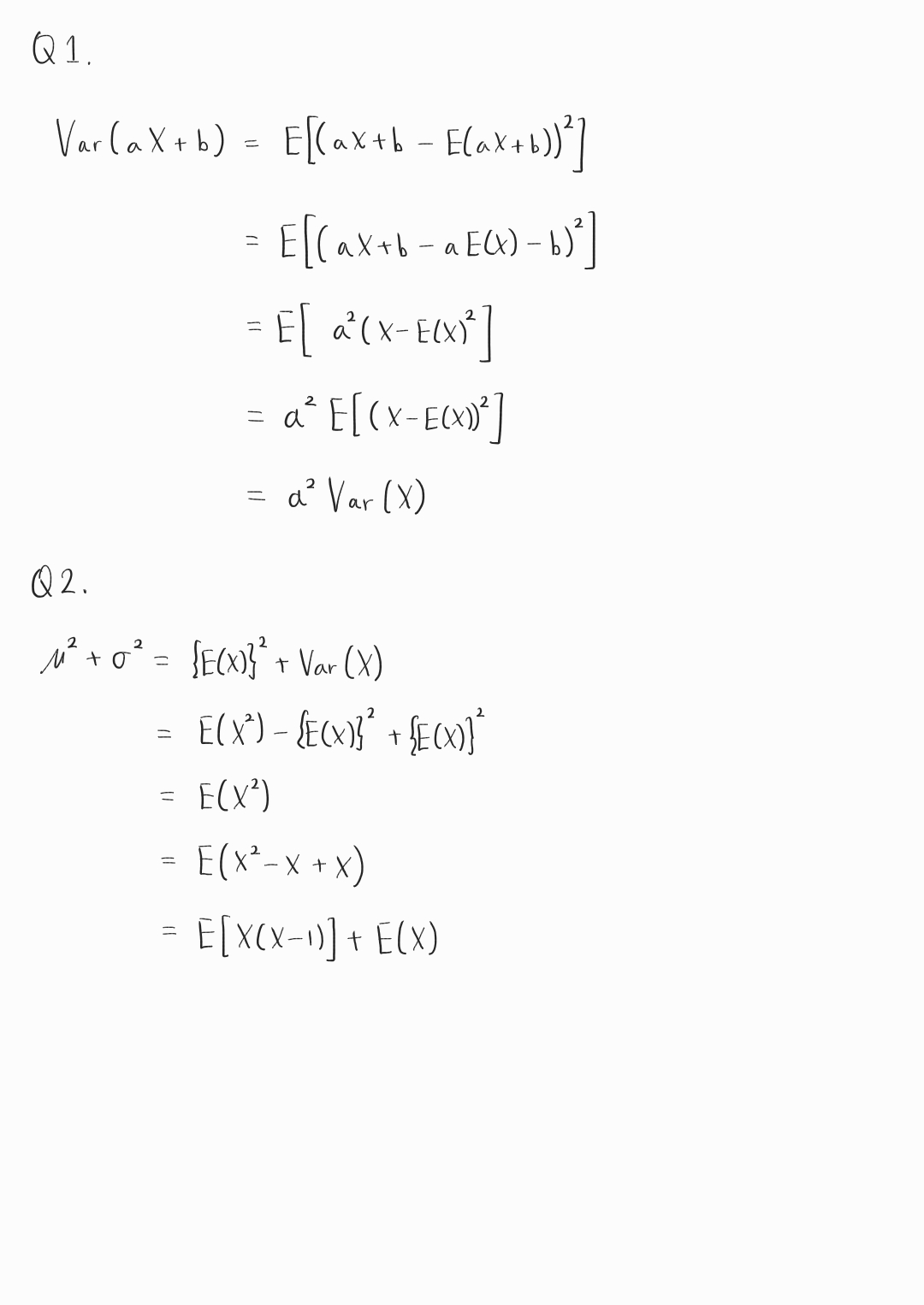 Q2. $E(X)=\mu$, $\sigma=\sqrt{Var(X)}$일 때, $\mu^2+\sigma^2=E[X(X-1)]+E(X)$임을 증명하시오.